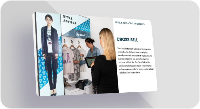 RETAIL & INTERACTIVE EXPERIENCES CROSS SELL The Cross Sell system is designed to allow sales associates the ability to create and display a virtually unlimited combination of styles, allowing customers to see in real-time what their new purchase will look like. The Cross Sell mobile application allows associates to check inventory and even place an order for pickup and/or delivery right from their mobile device.