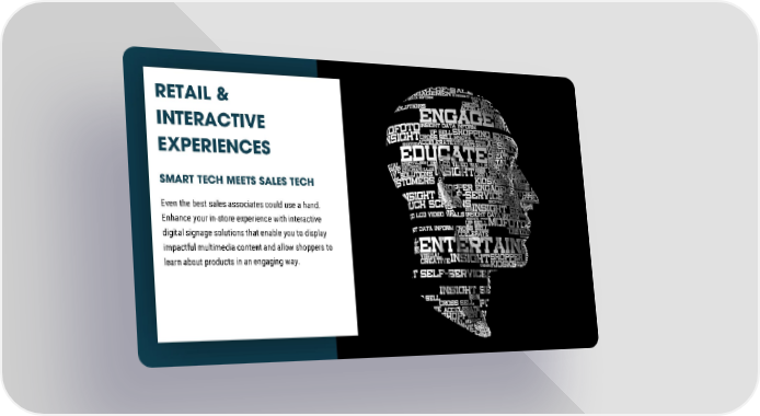 RETAIL & INTERACTIVE EXPERIENCES SMART TECH MEETS SALES TECH Even the best sales associates could use a hand. Enhance your in-store experience with interactive digital signage solutions that enable you to display impactful multimedia content and allow shoppers to learn about products in an engaging way.