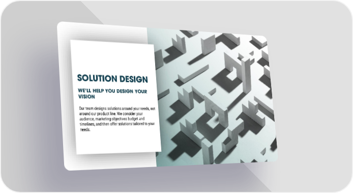 SOLUTION DESIGN WE’LL HELP YOU DESIGN YOUR VISION Our team designs solutions around your needs, not around our product line. We consider your audience, marketing objectives budget and timelines, and then offer solutions tailored to your needs.