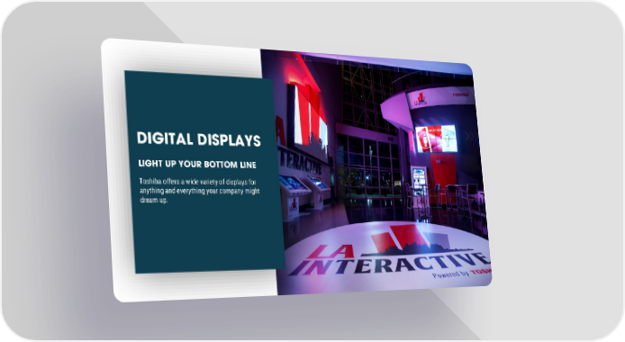 Intro to TOSHIBA Digital Signage Page 1 Page 3DIGITAL DISPLAYS LIGHT UP YOUR BOTTOM LINE Toshiba offers a wide variety of displays for anything and everything your company might dream up.