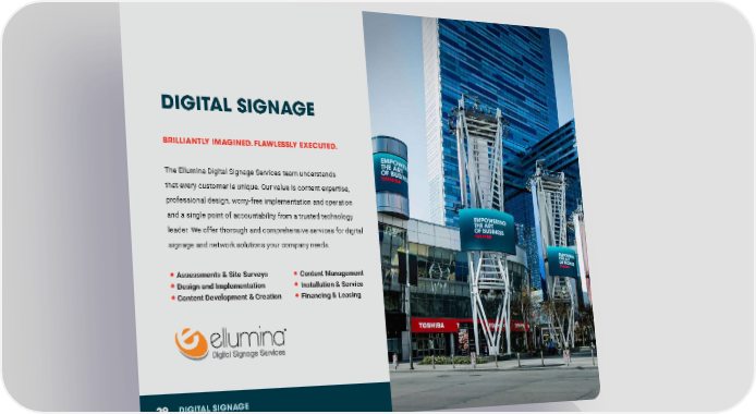 DIGITAL SIGNAGE BRILLIANTLY IMAGINED. FLAWLESSLY EXECUTED. The Ellumina Digital Signage Services team understands that every customer is unique. Our value is content expertise, professional design, worry-free implementation and operation and a single point of accountability from a trusted technology leader. We offer thorough and comprehensive services for digital signage and network solutions your company needs. ● ● Assessments & Site Surveys Content Management ● ● Design and Implementation Installation & Service ● ● Content Development & Creation Financing & Leasing 29 DIGITAL SIGNAGE
