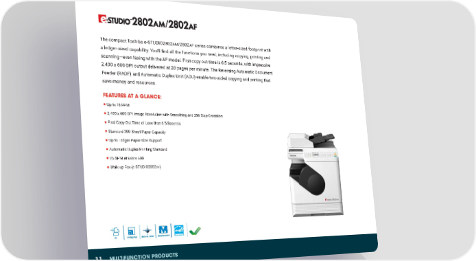The compact Toshiba e-STUDIO2802am/2802af series combines a letter-sized footprint with a ledger-sized capability. You’ll find all the functions you need, including copying, printing and scanning—even faxing with the AF model. First copy out time is 6.5 seconds, with impressive 2,400 x 600 DPI output delivered at 28 pages per minute. The Reversing Automatic Document Feeder (RADF) and Automatic Duplex Unit (ADU) enable two-sided copying and printing that save money and resources. FEATURES AT A GLANCE: ● Up to 28 PPM ● 2,400 x 600 DPI Image Resolution with Smoothing and 256-Step Gradation ● First Copy Out Time of Less than 6.5 Seconds ● Standard 300-Sheet Paper Capacity ● Up to Ledger-Paper-Size Support ● Automatic Duplex Printing Standard ● 25 SPM at 600 x 600 ● Walk-up Fax (e-STUDIO2802AF) PPM S 25 Workgroup Black & White Multifunction 11 MULTIFUNCTION PRODUCTS
