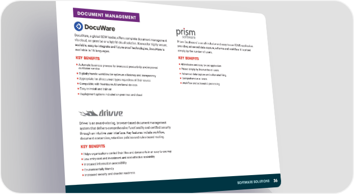 DOCUMENT MANAGEMENT DocuWare, a global ECM leader, offers complete document management Prism DocRecord is an all-inclusive and easy-to-use EDMS application via cloud, on-premise or a hybrid-cloud solution. Known for highly secure, providing advanced data capture, e-Forms and workflow. It is priced scalable, easy-to-integrate and future-proof technologies, DocuWare is simply by the number of users. available in 16 languages. KEY BENEFITS KEY BENEFITS ● All-inclusive and easy-to-use application ● Automate business process for increased productivity and improved ● Priced simply by the number of users customer service ● Advanced data capture and automated filing ● Digitally handle workflow for optimum efficiency and transparency ● Comprehensive e-Forms ● Appropriate for all document types regardless of their source ● Workflow and automated processing ● Compatible with Toshiba multifunctional devices ● Easy to install and train on ● Deployment options included on-premises and cloud Drivve is an award-winning, browser-based document management system that delivers comprehensive functionality and certified security through an intuitive user interface. Key features include workflow, document conversion, retention policies and rules-based routing. KEY BENEFITS ● Helps organizations control their files and documents in an easy-to-use way ● Low entry cost and investment and cost-effective scalability ● Increased information accessibility ● Environmentally friendly ● Increased security and disaster readiness SOFTWARE SOLUTIONS 36